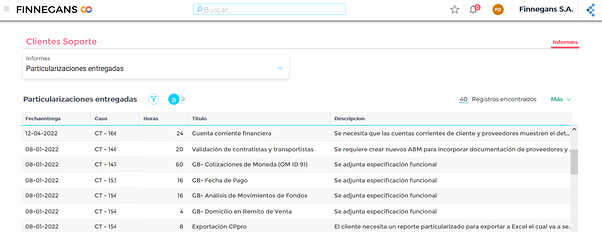 Ingresando al informe de Particularizaciones Entregadas podrás ver el listado de todas las particularizaciones que gestionamos y Finnegans te ha entregado con su número de caso, horas de desarrollo, testeo y entrega, título y la descripción.