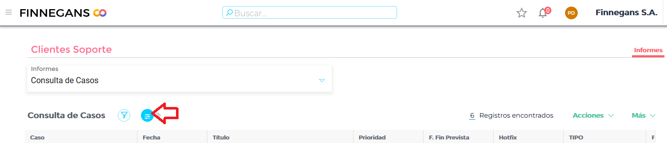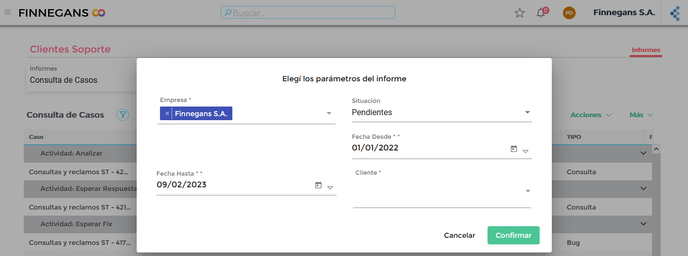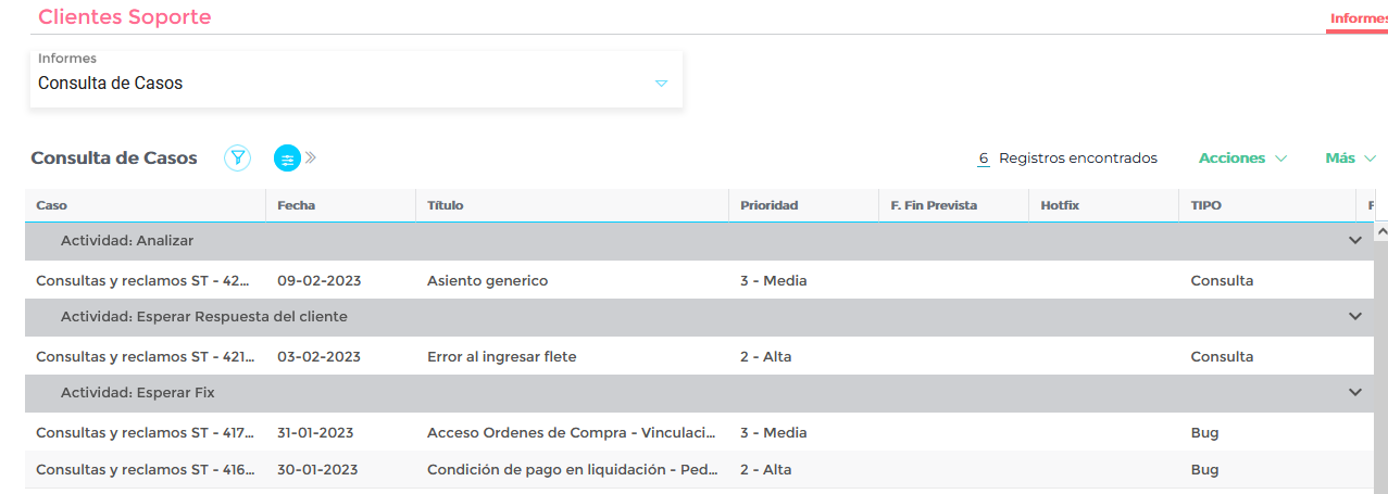 .Ingresando al informe de Consulta de Casos podrás ver el listado de todos los casos generados con Finnegans agrupados por la actividad actual de los mismos.