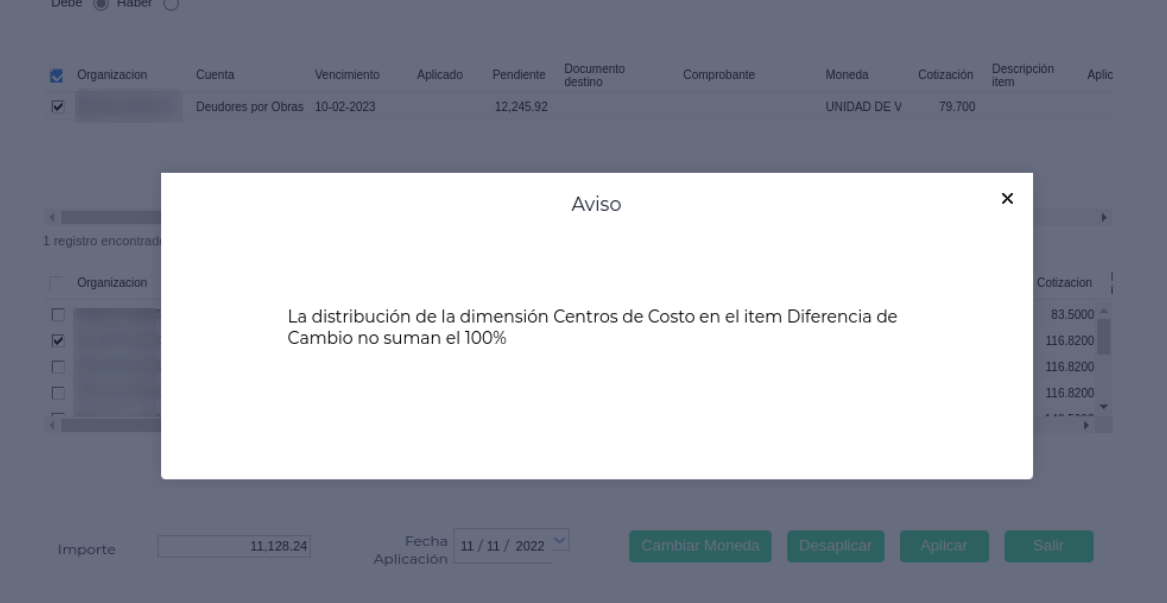 Consulta: Al aplicar documentos de distinta fecha, en moneda extranjera, se visualiza el mensaje de advertencia “La distribución de la dimensión xx en el ítem Diferencia de Cambio no suman el 100%”