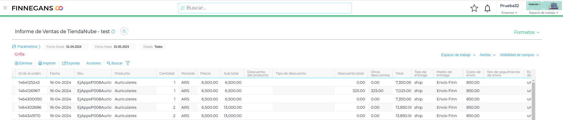 Visualizar información relacionada a la venta como ID Orden, Fecha creación, Producto, SKU , Cantidad, Precio TN, Descuentos item/pedido e Importe total.