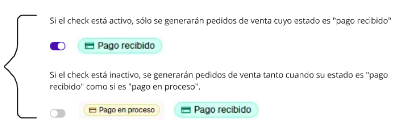 - Si el check está inactivo, se generarán pedidos de venta tanto cuando su estado es “pago recibido” como si es “pago en proceso”.