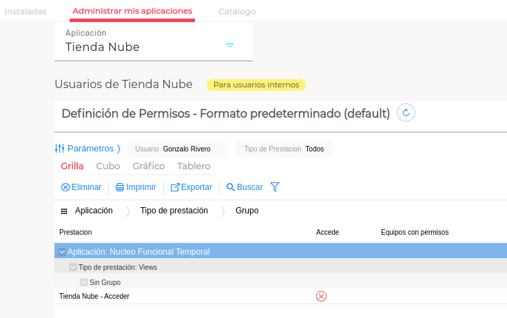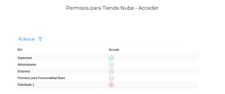 - En esta pantalla de permisos, presionar como se ve en la imagen, sobre la cruz roja en la fila de Tienda Nube: