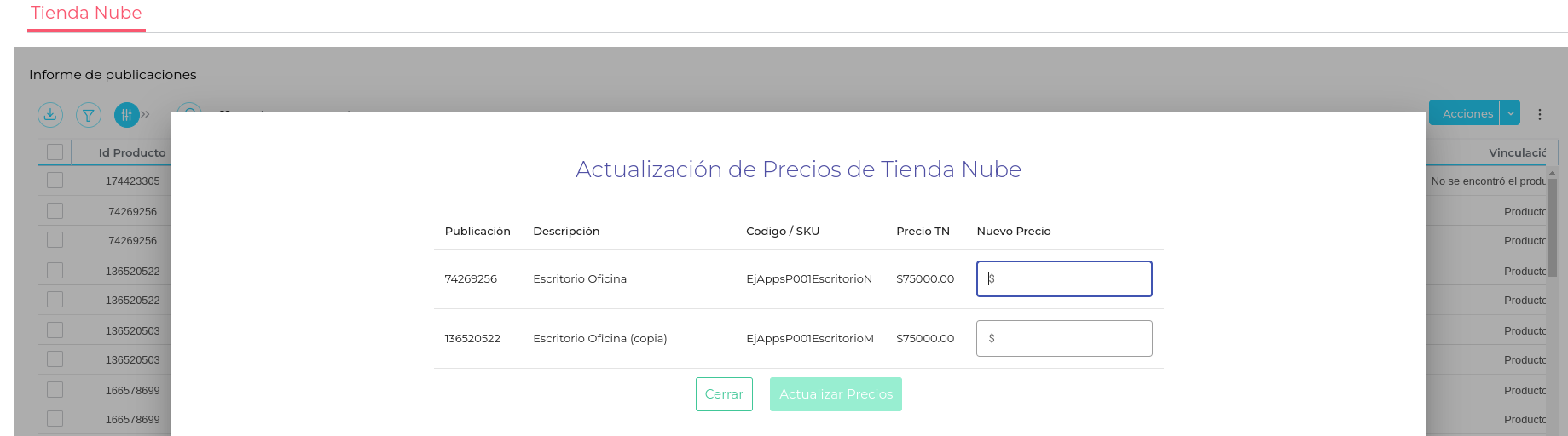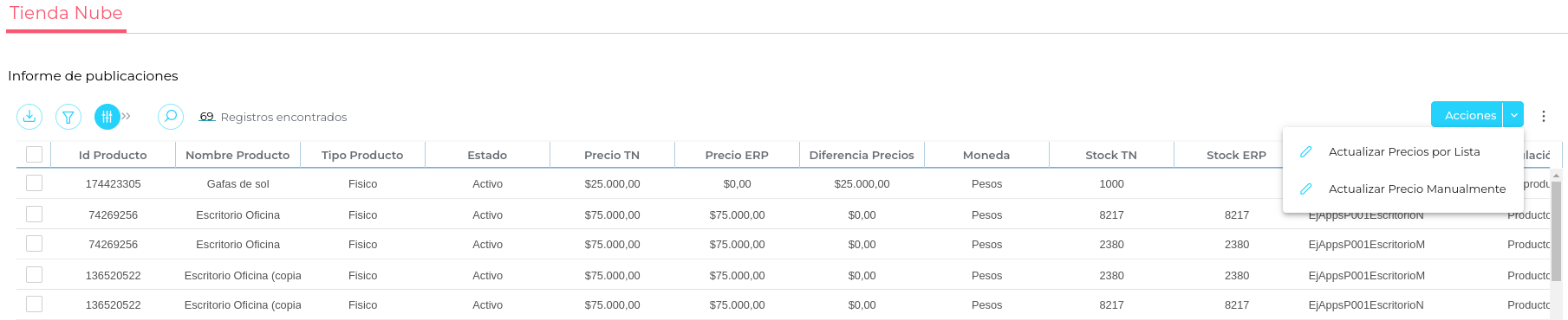 Visualizar los productos publicados en Tiendanube y su información relacionada como Nombre del Producto, SKU, Stock y Precio.