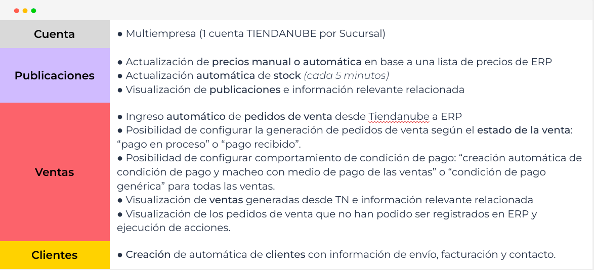 - Multiempresa (Puedes vincular tantas cuentas de Tienda Nube como desees, siempre y cuando cada cuenta esté asociada a una sucursal diferente)