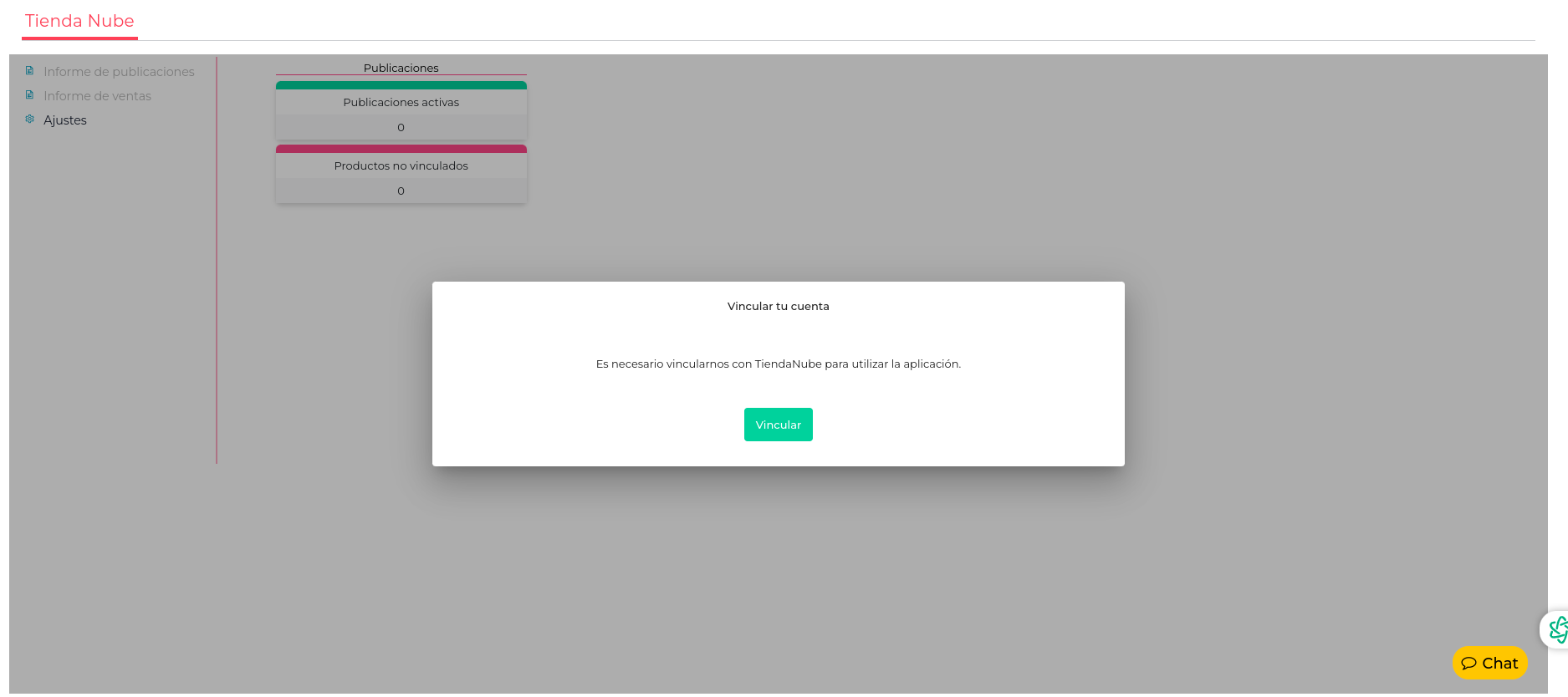 Lo primero que se debe hacer cuando se abre la Aplicación es Vincular la Aplicación a la cuenta de TiendaNube de la empresa. La propia aplicación emitirá este mensaje al abrirla por primera vez: