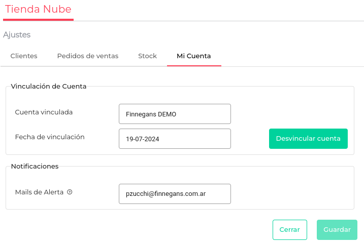 Esta solapa muestra la cuenta vincuada y la fecha de Vinculación de la Sucursal con la cuenta de TN. Además la posibilidad de desvincular la misma de ser necesario.