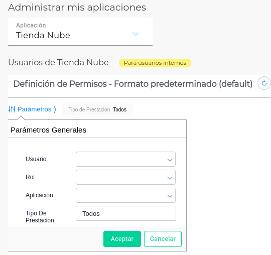 - En Definición de permisos → “Parámetros”, seleccionar el nombre del “Usuario” y presionar “Aceptar”.