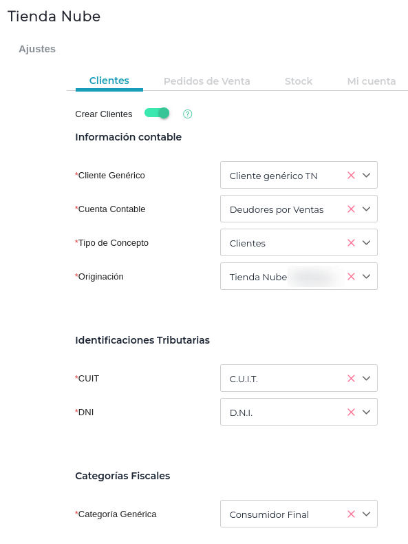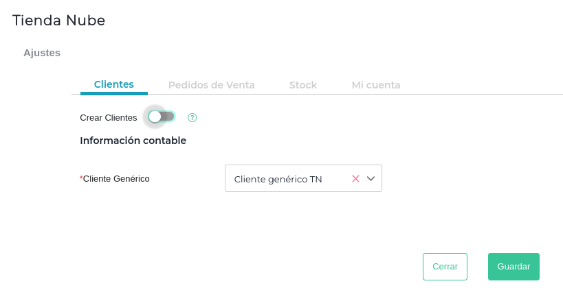 En el caso que el cliente de TN no exista en el ERP, y no se desea crear un nuevo cliente, tendrá la opcion de que se utilice un cliente genérico, desactivando la opción Crear Cliente.