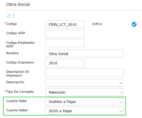 -Obra Social (FINN_LCT_3010) cuenta debe: Sueldos a Pagar cuenta haber : Cargas sociales a pagar/ Suss a pagar
