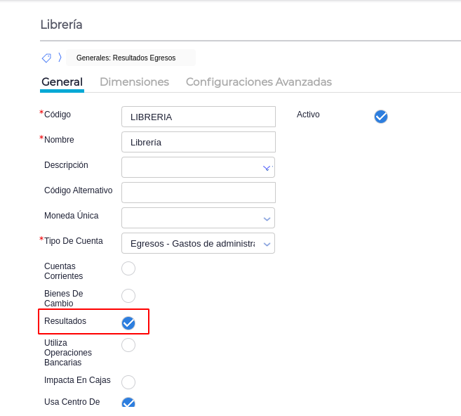 - Después de realizar el asiento anterior, se debe configurar la cuenta como una cuenta de resultados.