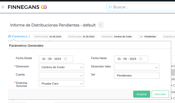 Antes de ejecutar el proceso de cierre contable, es necesario que todos los saldos pendientes imputen a centros de costos. Para verificarlo se debe ejecutar el Informe de Distribuciones Pendientes.