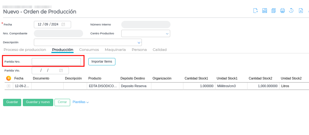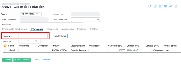 1. Una vez seleccionado el proceso de producción, en la solapa producción se debe indicar en el campo partido la identificación de la misma sin la posibilidad de ingresar una fecha de vencimiento.