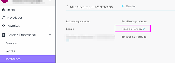 Para configurar las partidas que se utilizaran para el alta de productos es necesario acceder al Menú→Gestion Empresarial→Inventarios→Maestro de Tipos de Partida