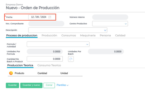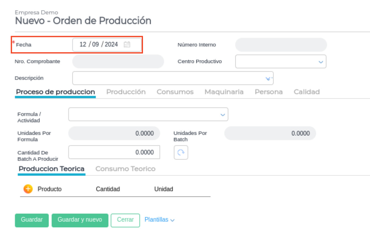 Se deben completar los campos para generar una nueva orden de producción indicando el producto a obtener y que haya sido configurado previamente según los pasos mencionados.