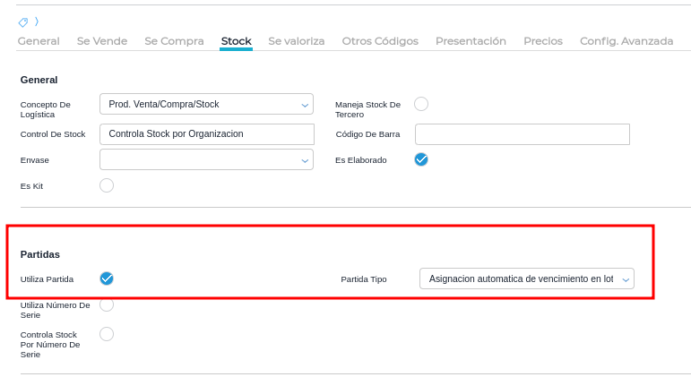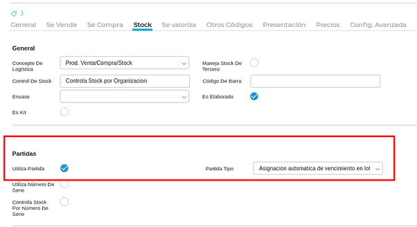 En la configuración de los productos, se debe tener en cuenta que aquellos que intervienen en el proceso productivo deben estar configurados en la solapa Stock con el check Utiliza Partida Activo, y en el Tipo de Partida seleccionar aquella que se haya configurado previamente.