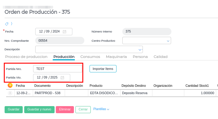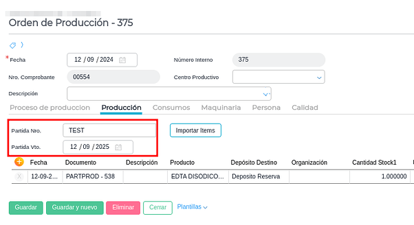 Para poder operar correctamente, es necesario configurar los productos que intervienen en el proceso productivo para que estos utilicen partidas con vencimiento. Una vez que se hayan configurado los productos de forma correcta, debe configurarse el tipo de partida con alguna de las opciones brindadas por el sistema para que se realice el cálculo de forma automática.