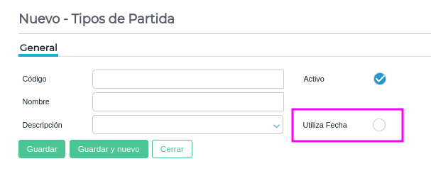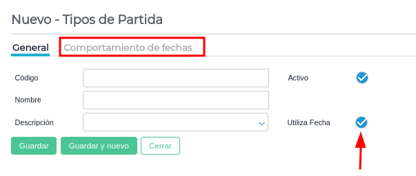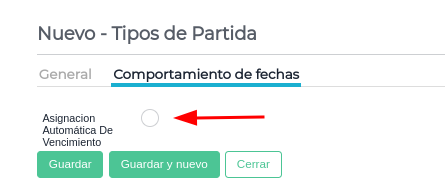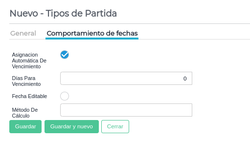 En el alta de un nuevo tipo de partida, se debe indicar que la misma utiliza fecha para acceder a la solapa de comportamiento de fechas, donde se determinara el criterio para asignar la fecha de vencimiento.