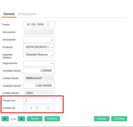 1. Fecha de Alta de producto: al seleccionar esta opción, la fecha de vencimiento para la partida creada se calculará con base en los días para el vencimiento a partir de la fecha de la transacción.