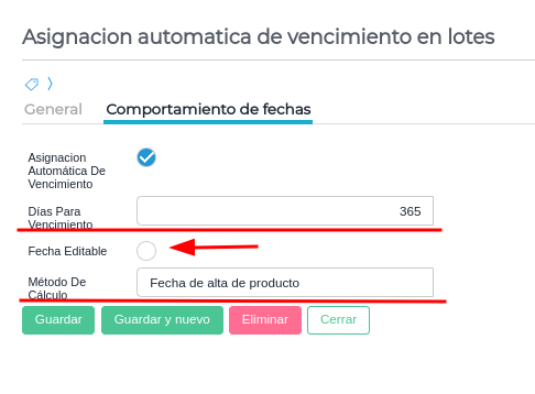 Esta funcionalidad permite asignar de forma automática la fecha de vencimiento en el alta de un nuevo lote/partida