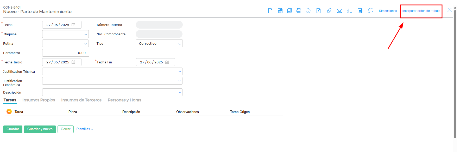 - Hacer clic en el botón de acción para incorporar orden de trabajo al Parte de Mantenimiento.