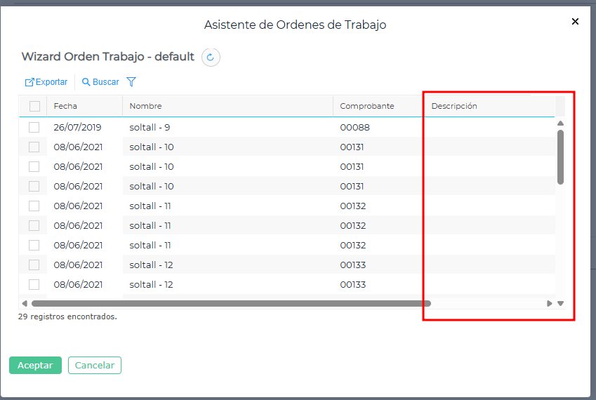 - Se abrirá el asistente con un listado de Órdenes de Trabajo disponibles.