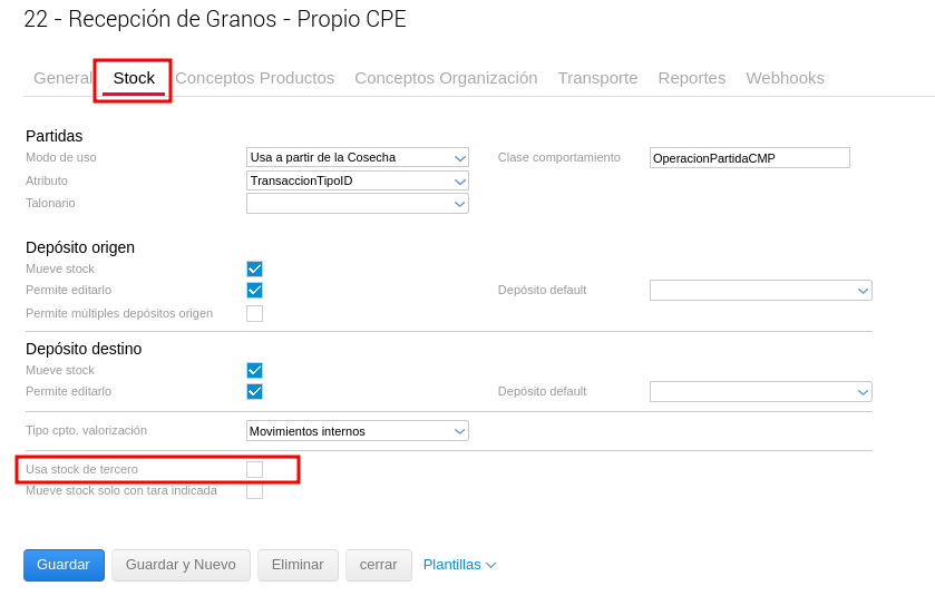 Recepciones: puede haber dos opciones de como llega el grano a la planta (no debe tener tildado usa stock de tercero, ya que la recepción impacta directo en stock propio)