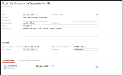 Una vez ejecutada esta actividad, la cual se realiza automáticamente, el proceso queda en la actividad Autorizar OC Nivel 1.