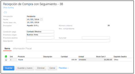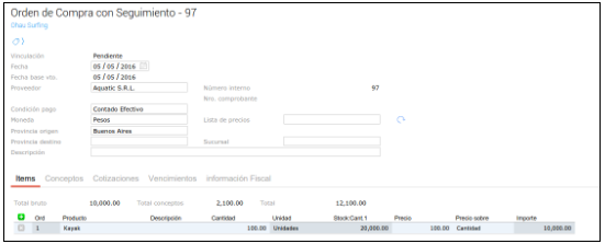 Se crea una Orden de Compra con Seguimiento por un total de $12.100,00 del producto Kayak para el proveedor Aquatic S.R.L.