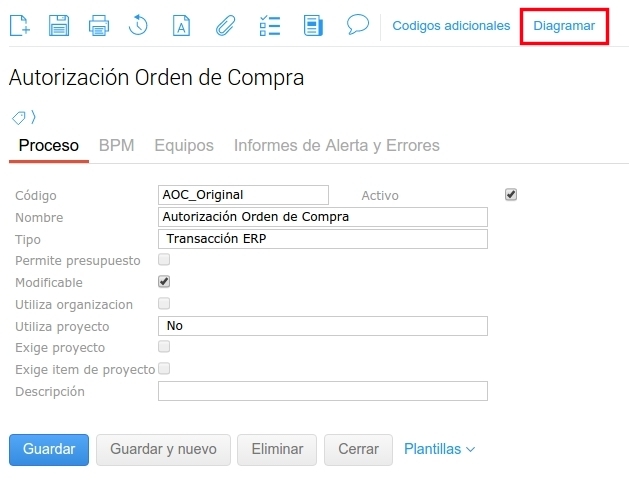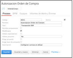 Se accede desde Menú→App Builder→ Diccionarios → Procesos, se selecciona “Autorización de Orden de Compra”.