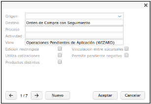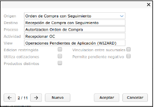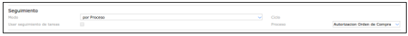El documento Orden de Compra con Seguimiento debe tener configurado en el apartado Seguimiento el modo “por Proceso” y seleccionar el proceso con el cual se está trabajando.