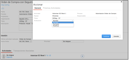 Recepcionar OC es una actividad de gestión externa. Se va a accionar una vez creado el documento que esté configurado en el workflow correspondiente.