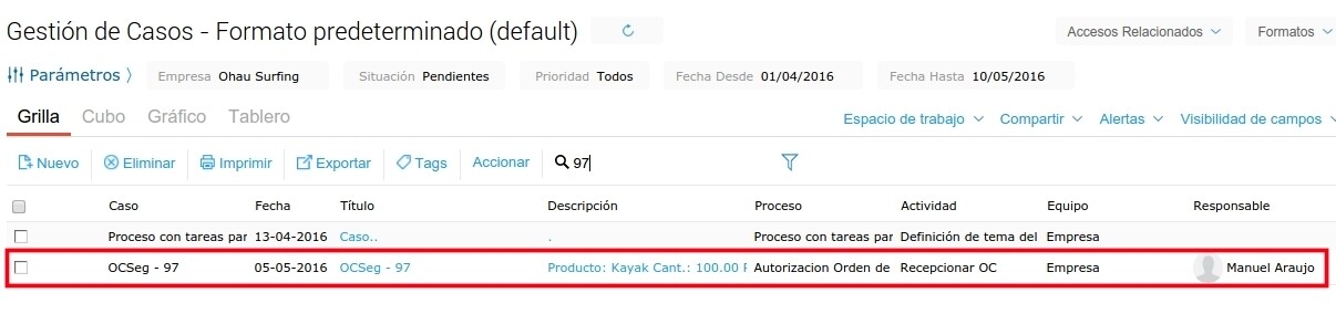 Luego de guardar el documento, para poder ver el caso que se ha generado: