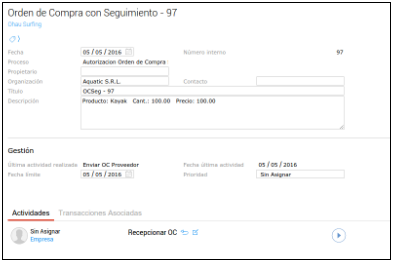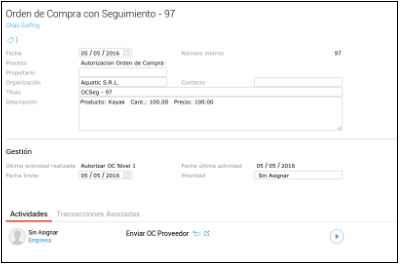 Si el monto es menor, como es el caso de este ejemplo, la próxima actividad pendiente será Enviar OC al Proveedor.