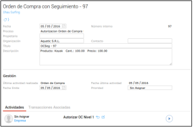 Se puede observar que la próxima actividad a ejecutar es Autorizar OC Nivel 1. Esto es porque de manera automática se corrió la actividad Notificar al gerente de Compras.