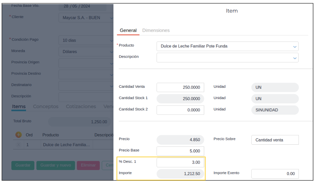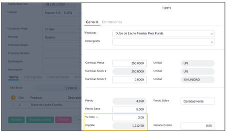 En segundo lugar se procederá a cargar el pedido de venta desde Gestión empresarial → Ventas → Pedidos donde se otorgorá con descuento configurado en el tipo de documento. Por ejemplo con un descuento del 3% en el item del producto, con una cantidad de venta de 250 y precio base 5.