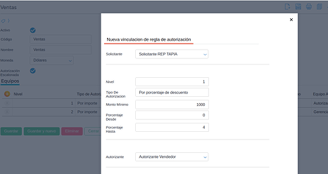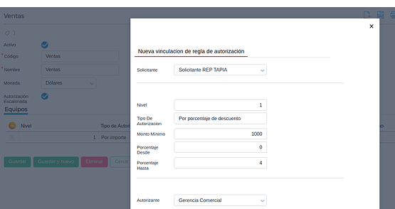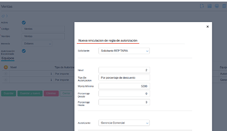 Se deberá establecer la regla de autorización para el documento a utilizar. Es en esta parte donde puedo configurar por porcentaje de descuento, importe o ambos.
