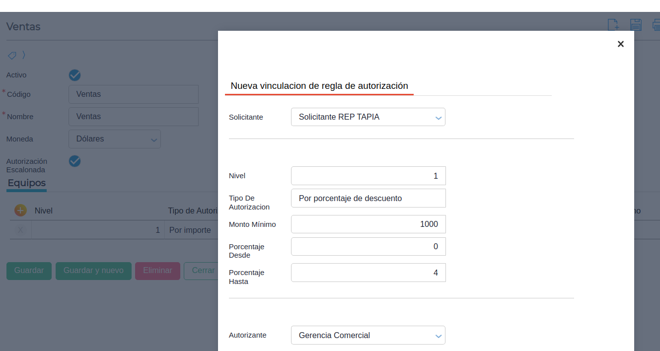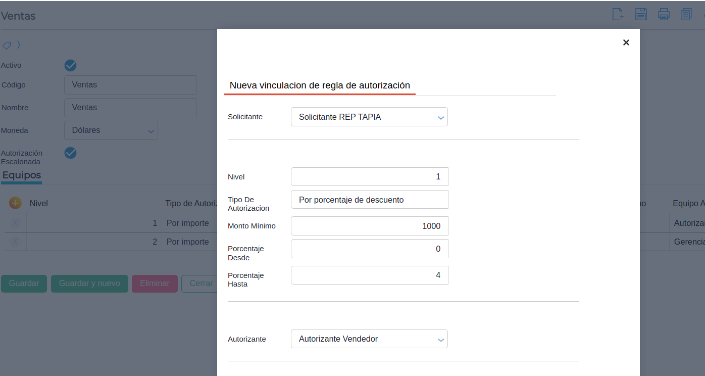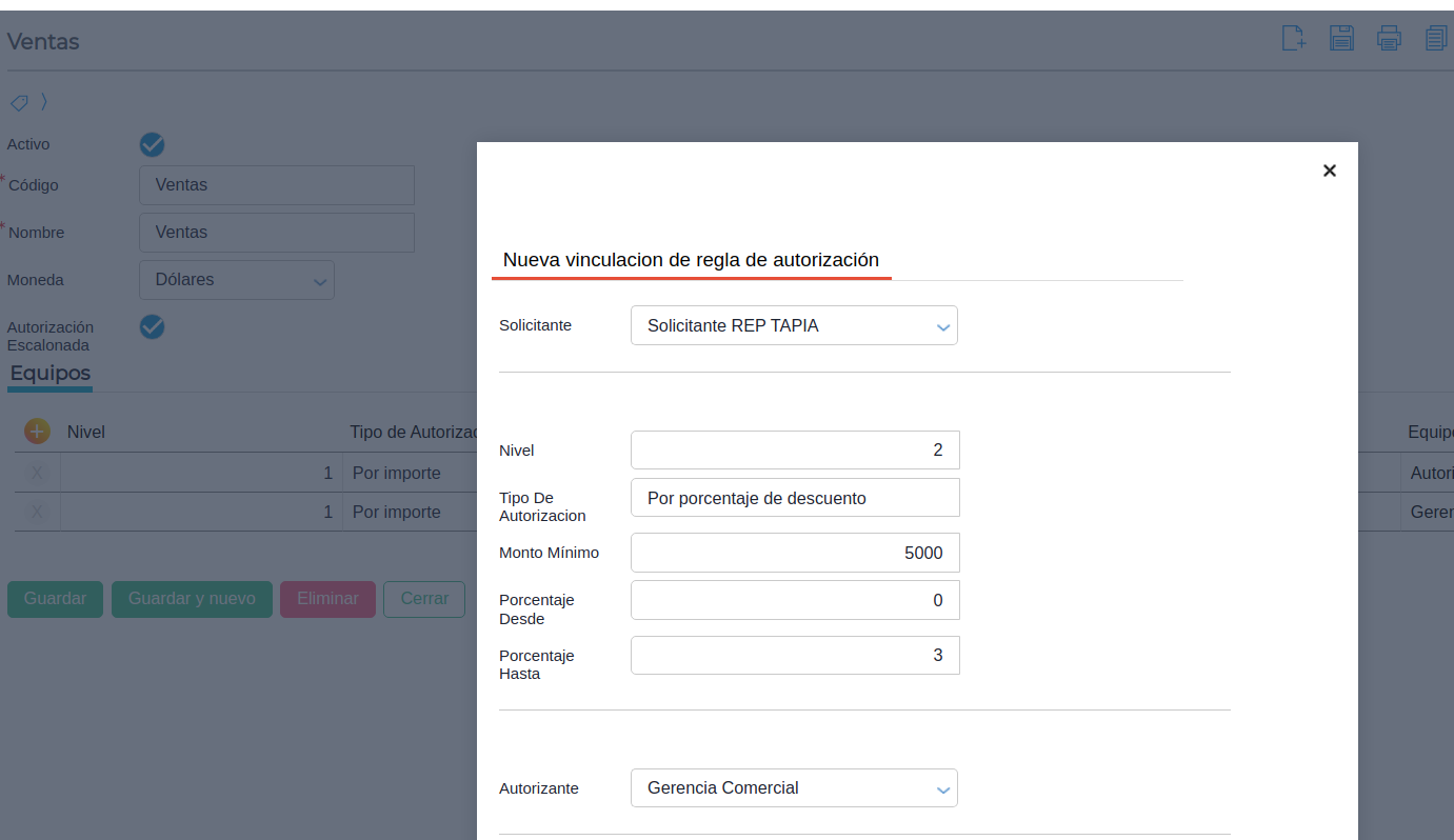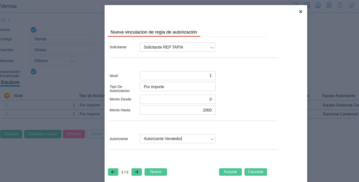 Caso de uso 2: Cabe destacar que se puede configurar la regla de autorización de forma escalonada. Esto quiere decir que, en la regla de autorización se puede configurar por niveles. Por ejemplo en la primera aprobación se podrá autorizar por importe y en la segunda aprobación por otro equipo autorizante por porcentaje de descuento.