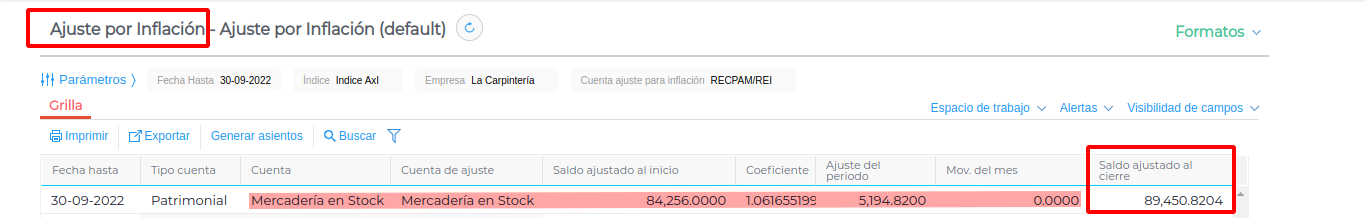 - Ir a Menú > Gestión Empresarial > Contabilidad > Transacciones > Ajuste por Inflación, donde vamos a visualizar el monto ajustado al cierre de la cuenta Mercaderías en Stock.