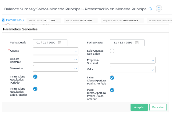 - Acceder desde Menú → Gestión empresarial → Contabilidad → Informes: Balance Sumas y Saldos Moneda Principal.