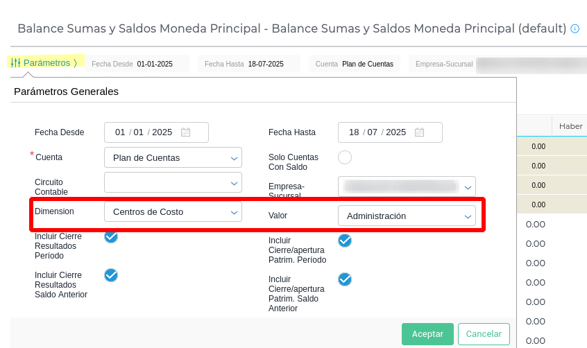 Aclaración: La función de “Dimensión” y “Dimensión Valor” en el Balance de Sumas y Saldos es principalmente para fines de gestión y análisis.