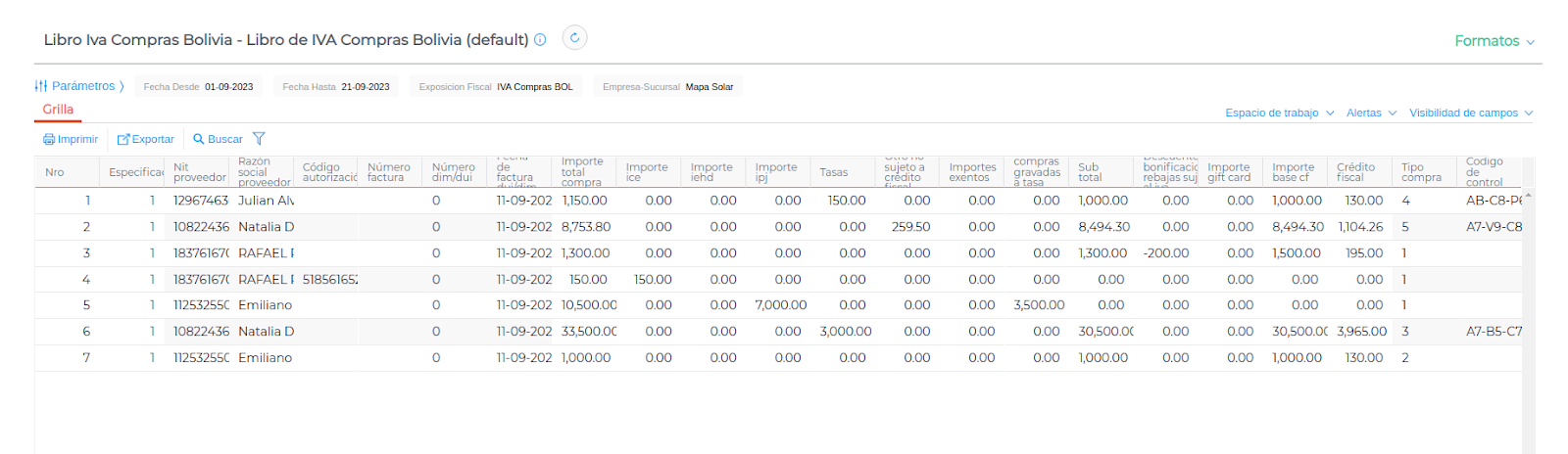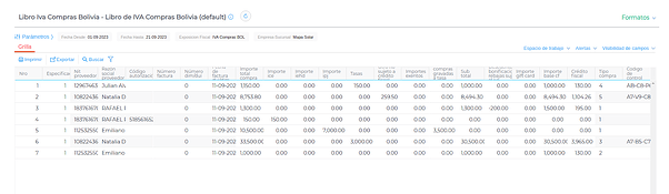 Menú → Gestión Empresarial → Impuestos → Iva → Libro Iva Compras Bolivia