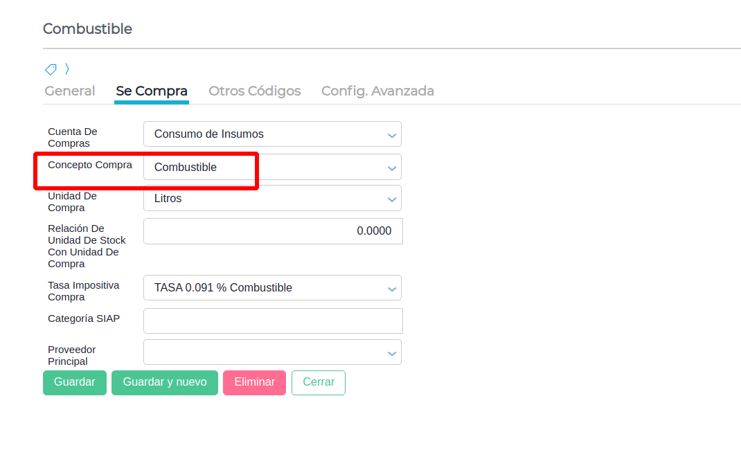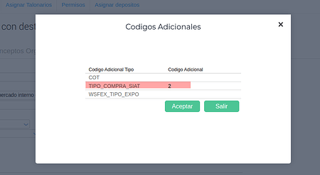 Una vez creado se debe completar el código adicional TIPO_COMPRA_SIAT con el valor correspondiente