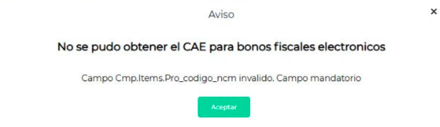 Consulta: Al solicitar CAE de una Nota de Crédito de venta que se encuentra dentro del Régimen de bono fiscal sale Aviso : No se pudo obtener el CAE para bonos fiscales electrónicos. Campo Cmp.Items.Pro_codigo_ncm invalido. Campo mandatario