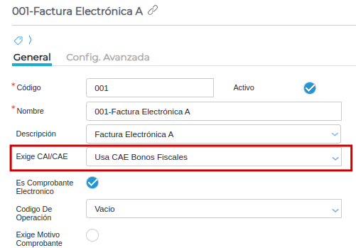Para configurarlo, desde el ABM de comprobante de tipo impositivo, se selecciona la opción “Usa CAE bonos fiscales”: