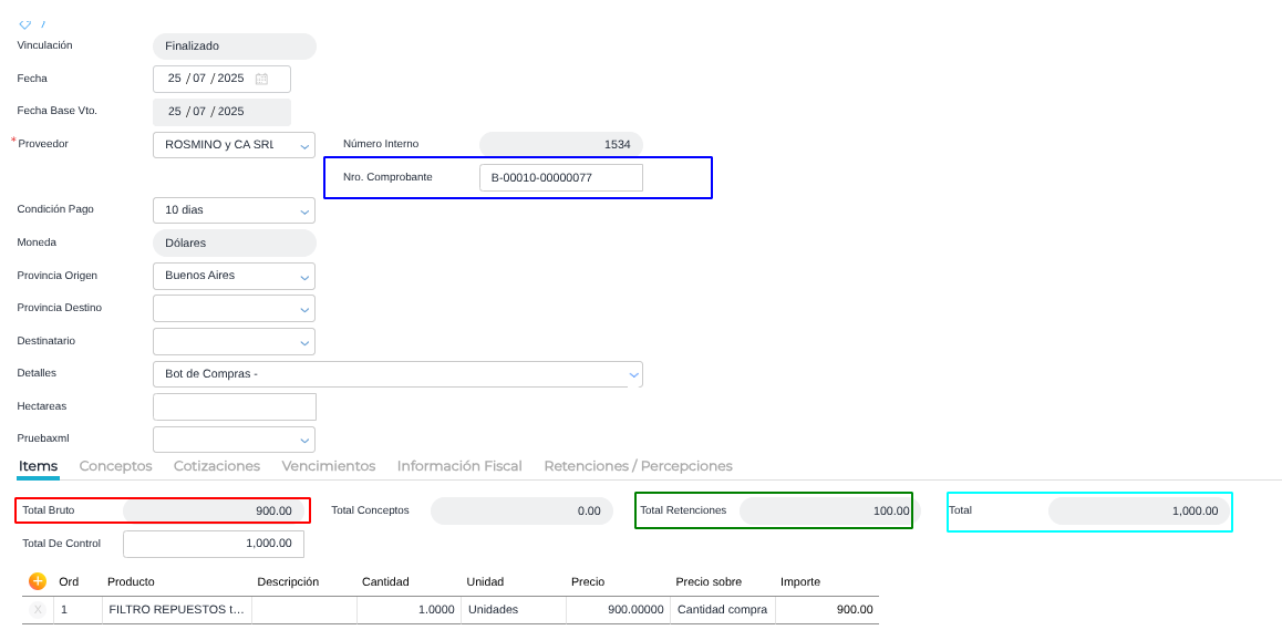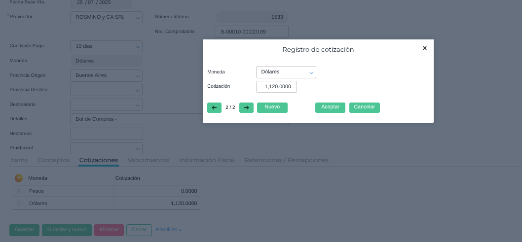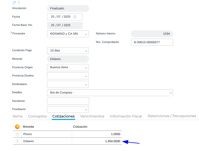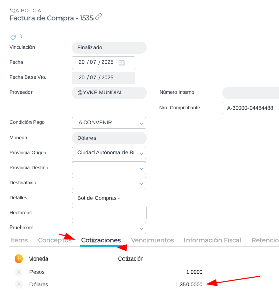 Cómo registrar facturas desde el bot de compras con una moneda distinta a la moneda principal. Las facturas podrán generarse en el ERP a pesar de que no tengan una cotización de la moneda secundaria para la fecha, ya que el sistema resolverá asignando una cotización más cercana a la fecha de comprobante que se encuentre cargada en el maestro de cotizaciones.