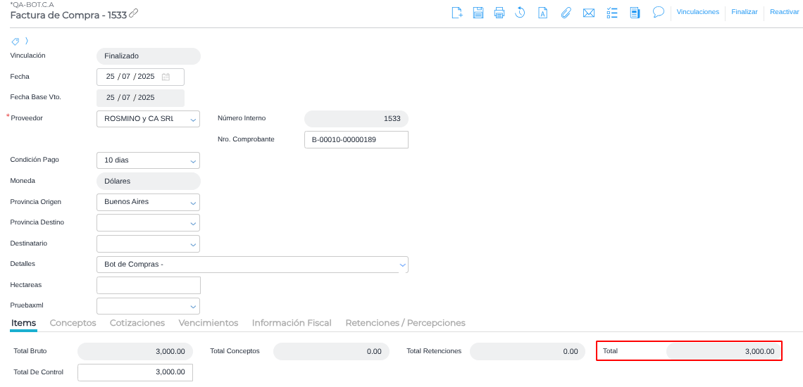 Ir a Menú → Gestión Empresarial → Compras → Facturas y chequear la factura creada.