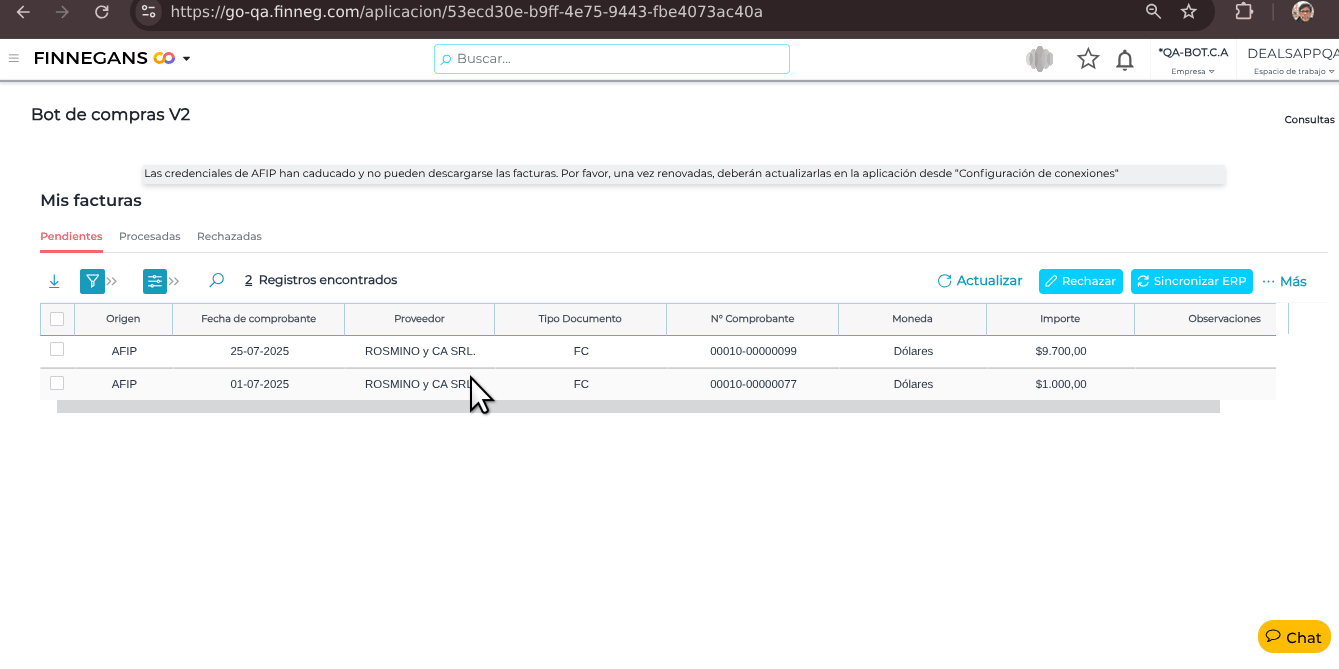 Ruta: Muro → Mis Aplicaciones -->Bot de Compras → Mis Facturas → Pendientes → Factura origen AFIP