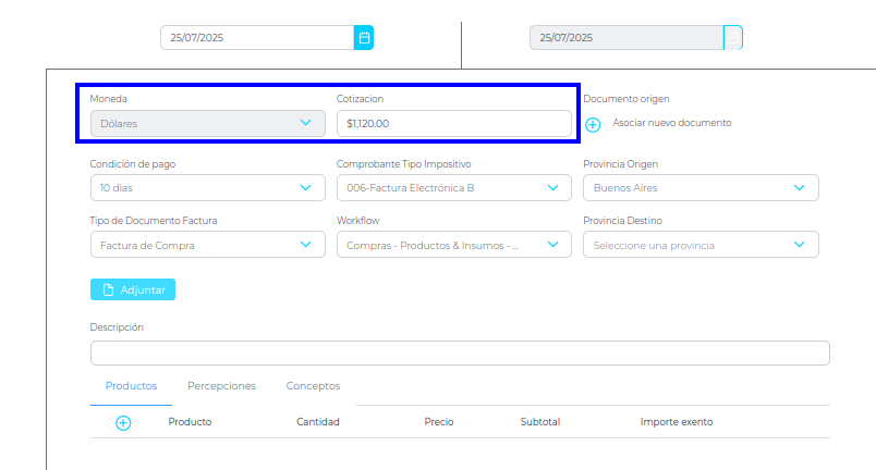 Caso 1 - Crear factura de compra en moneda USD en empresa Argentina que no trae la cotización de AFIP.