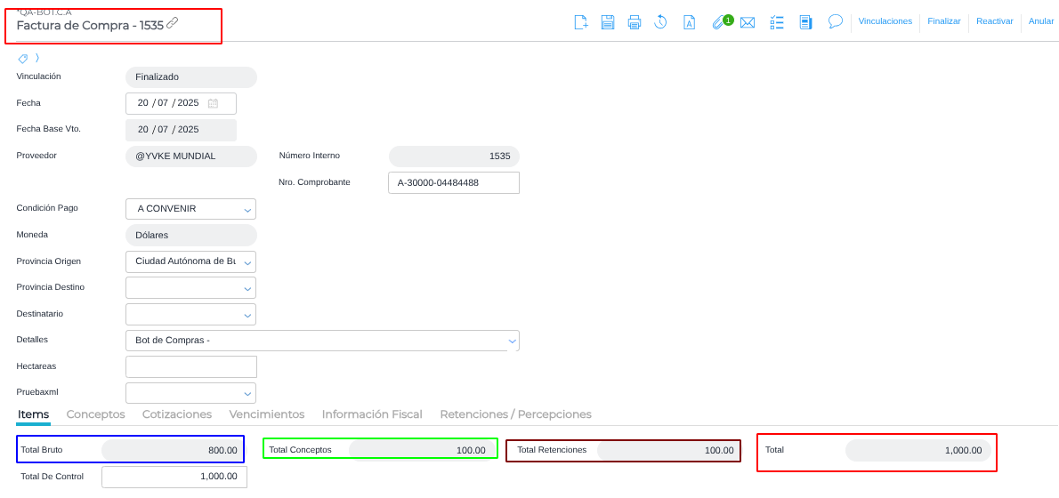 Caso 2 - Crear factura de compra en moneda USD en empresa Argentina que trae la cotización de AFIP.