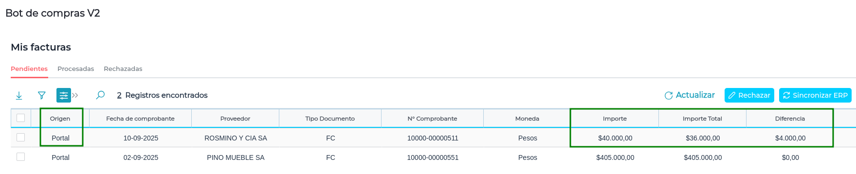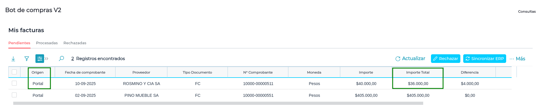 Con el objetivo de mejorar la visualización de información de Facturas de Compra provenientes del Portal de Proveedores, en la solapa “Pendientes” de “Mis Facturas” se agregaron los campos: